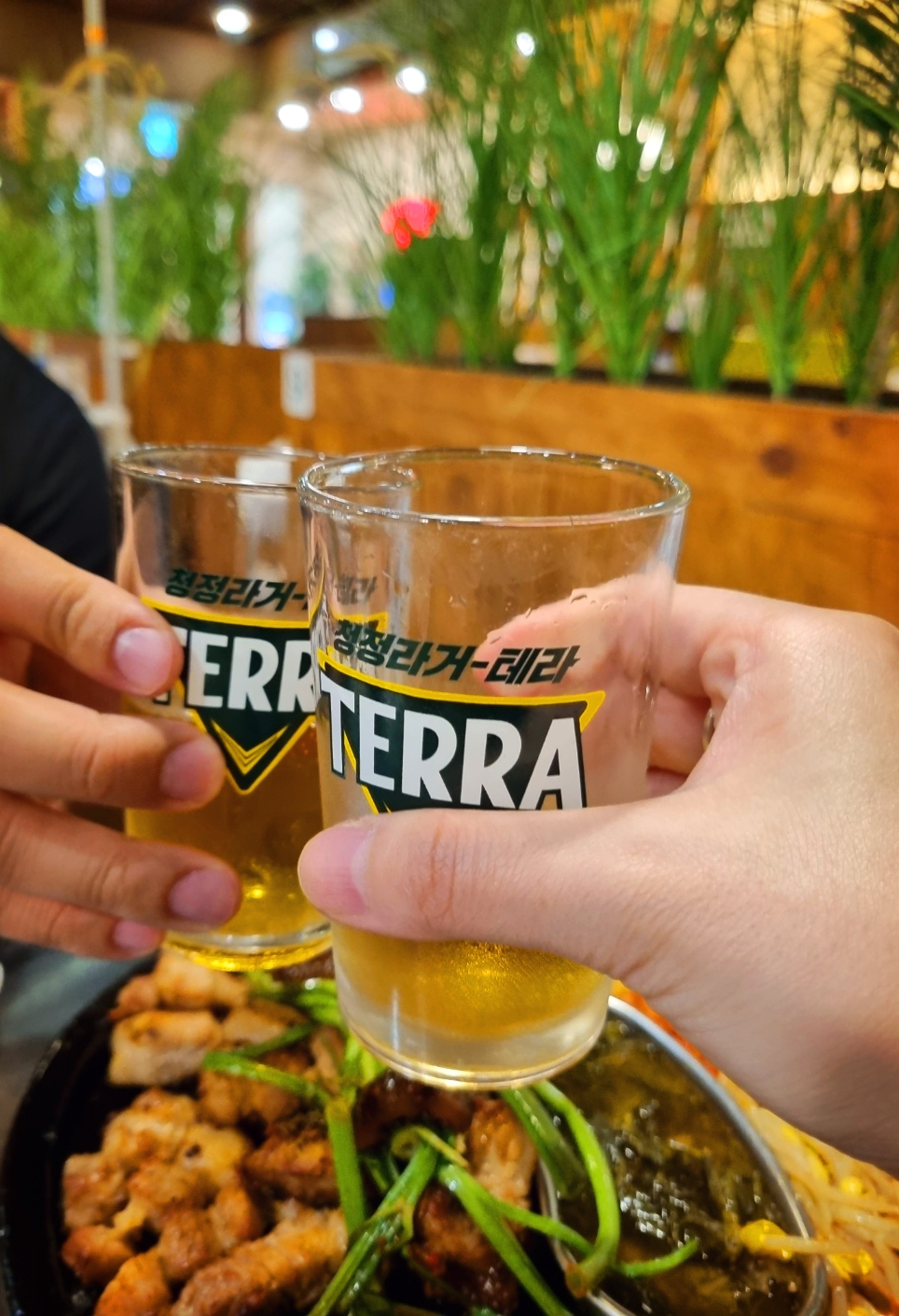 고기를 먹을 때 술을 안먹을 수 없다;ㅎㅎ 맥주는 한맥을 시켰는데 꿀같은 달콤한 맛이 느껴졌다. 카스에 꿀탄 느낌?? 더 고급진 맛이라 할까? 한맥~ 우리나라 맥주의 새로운 발견이었다. 유리잔은 테라이지만 술은 한맥이다ㅋㅋ;;;