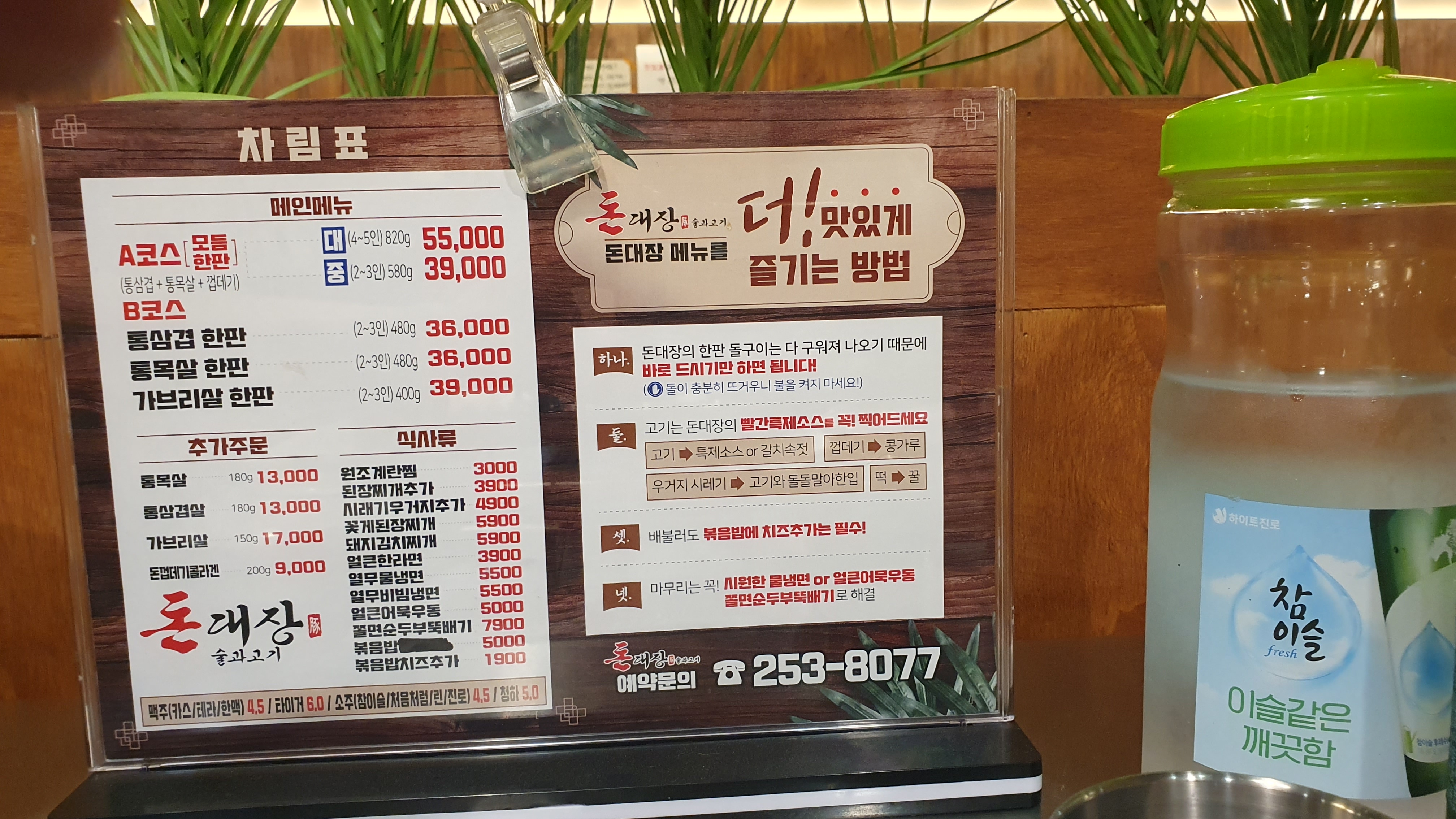 돈대장 차림표이다. 내가 시킨 메뉴는 A코스 모듬 한판 중이다. 2~3인이 먹을 수 있는 양이라고 하는데... 개인적으로 느낀점은 2인용인듯하다ㅎㅎ 3인은.... 식사류를 추가로 시켰을 때 3인까지 먹을 수 있는 것 같다. 사진에는 없지만 개인적으로 물냉면을 시켜 먹었기에 2인이 먹었을 때 배불리 먹을 수 있다.