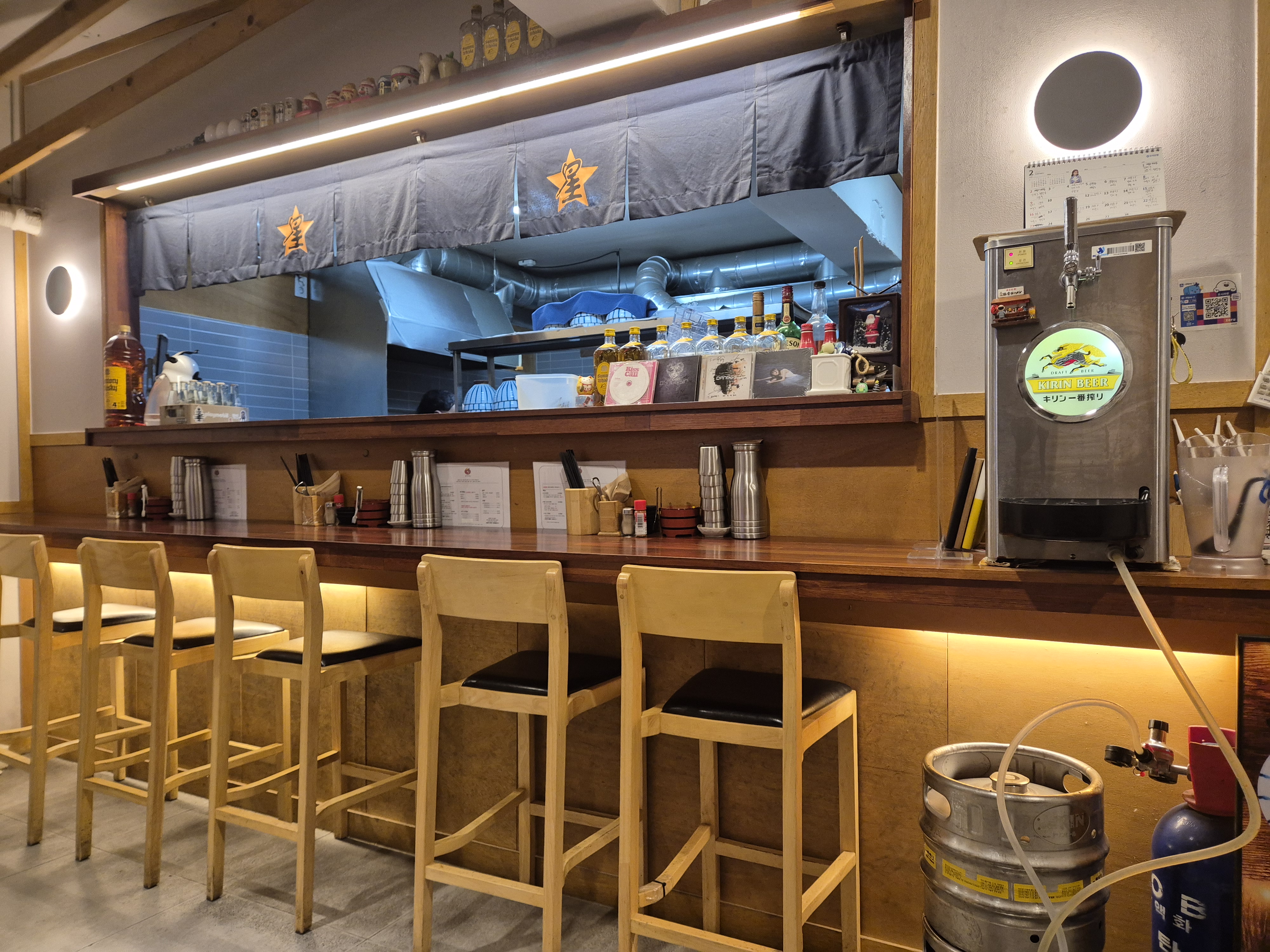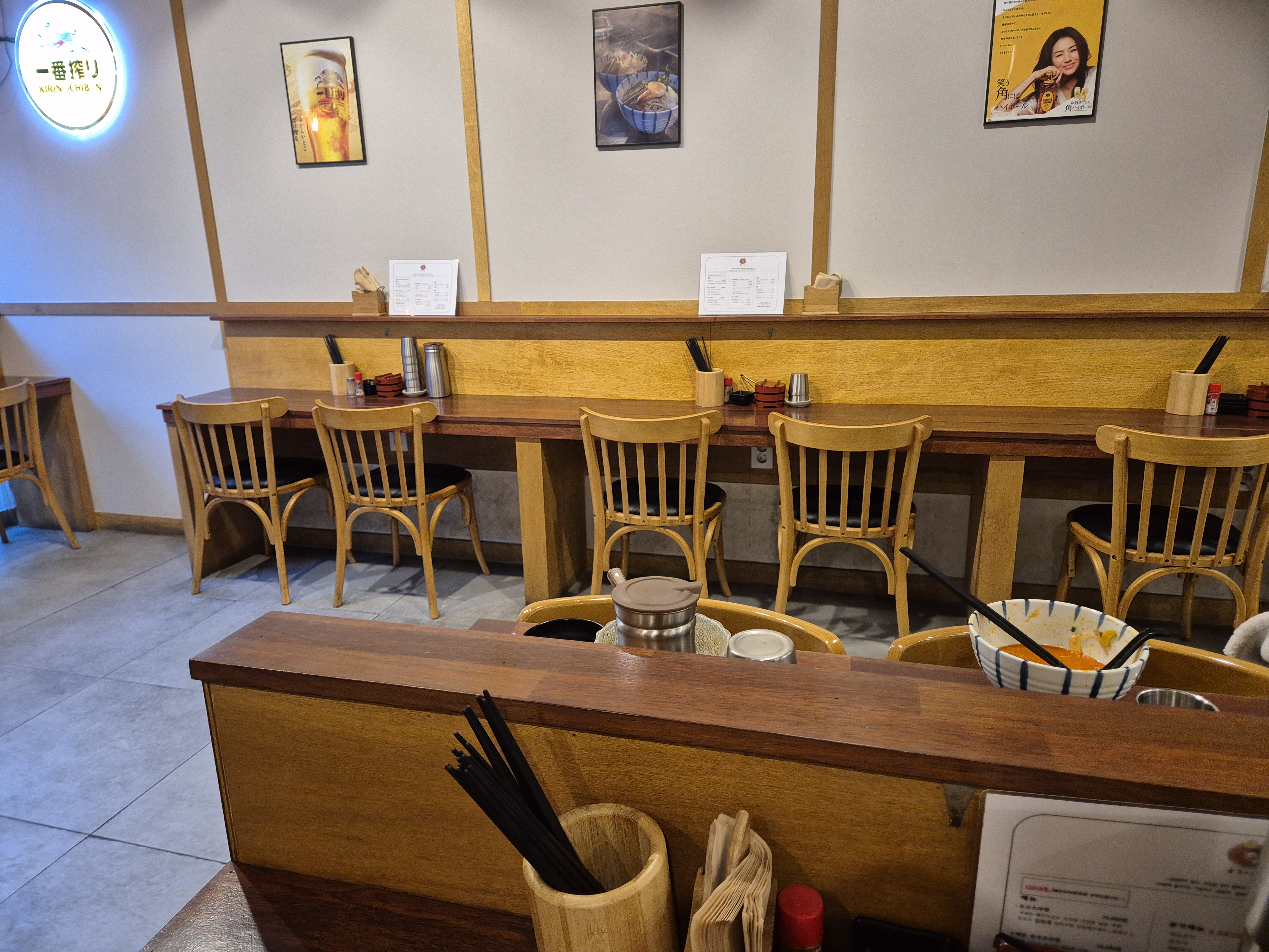 호시라멘은 작지만 아늑한 공간으로, 일본의 전통 라멘집을 연상케 하는 심플한 인테리어가 특징입니다. 카운터석과 테이블석이 적절히 배치되어 있어 혼자 오는 손님도 부담 없이 식사를 즐길 수 있습니다. 조명은 따뜻한 노란빛으로, 편안한 분위기를 자아내고 있었어요.