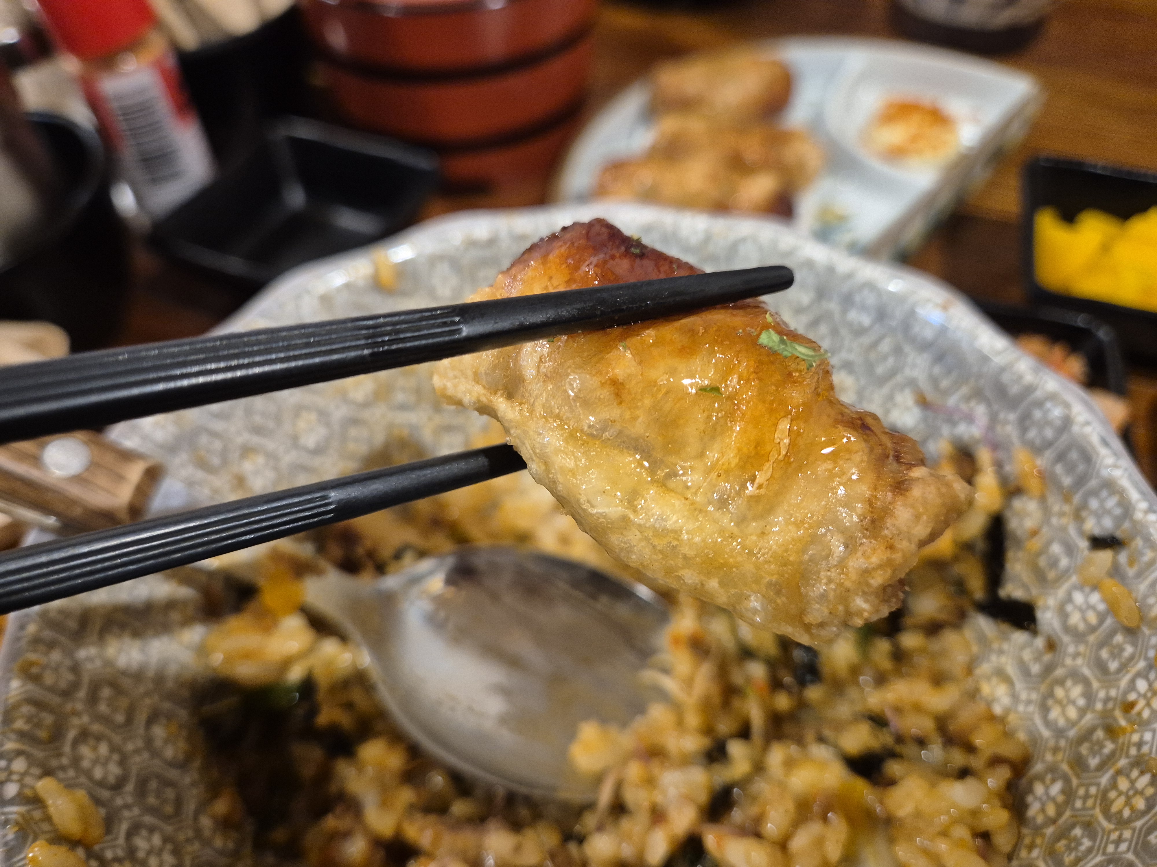 닭껍질로 만든 교자만두입니다. 신기해서 시켜 봤는데 닭껍질을 좋아하지 않는 분은 시키지 않는 게 좋을... 그런 음식이었습니다. 개인적으로는 좀 그랬지만 닭의 전반적인 부위를 좋아하시는 분은 즐겁게 즐길 수 있을 것 같았습니다.