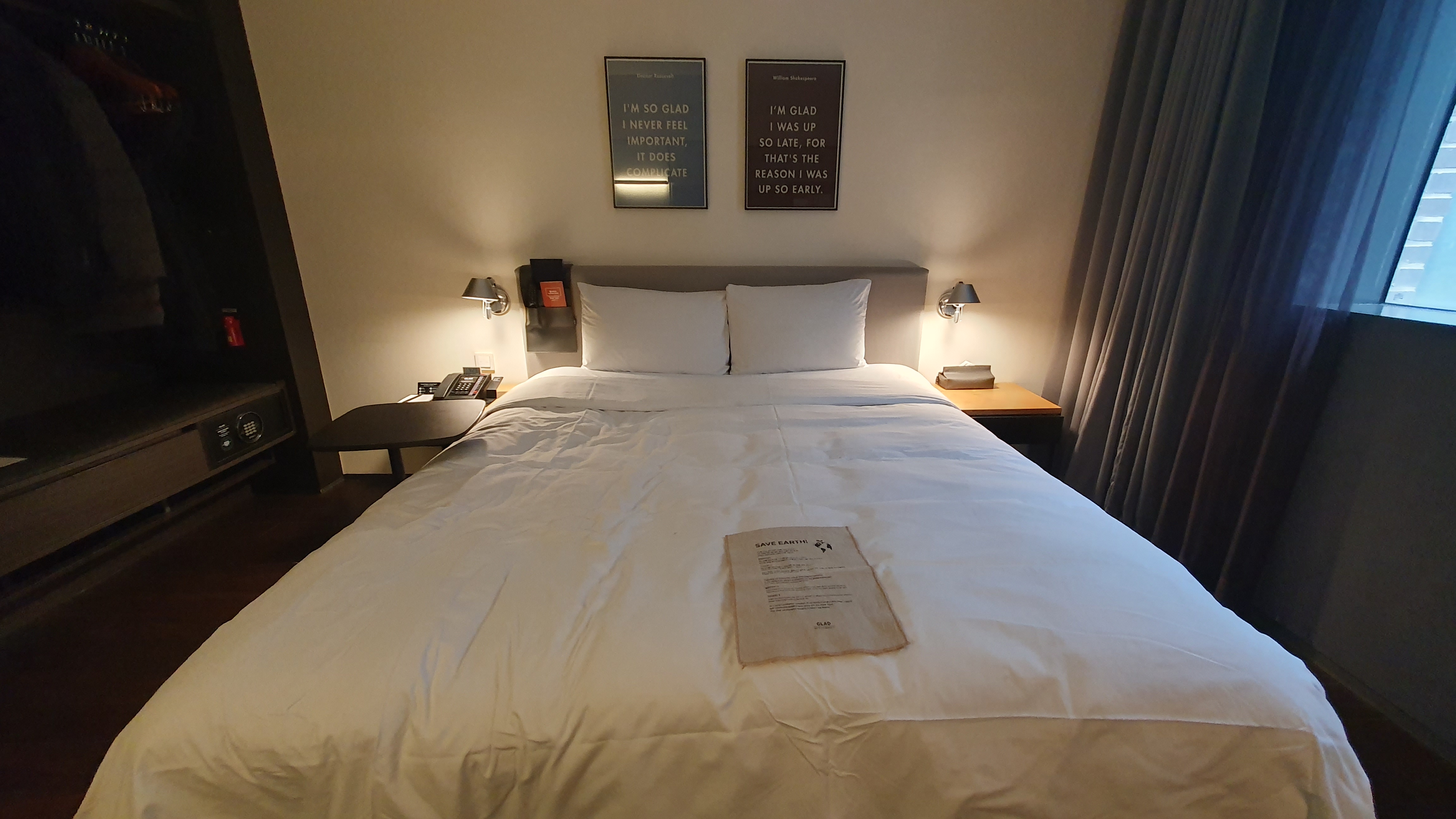 글래드 호텔에 들어오니 절약을 강조한다. 호텔에 와서 쉬려 하는데 절약을 생각해야 하다니ㅎㅎ 물건 쓰기가 겁난다. 그렇다고 큰 것은 아니고 치약이나 칫솔 등이 없고 필요한 사람은 데스크에 문의하라고 한다ㅋ 그래도 이렇게 지구를 생각하다니 대단하다.
